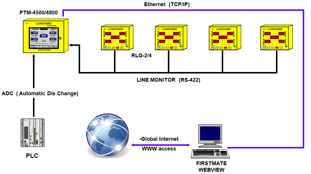 Communication technologies from Helm offer tools to the automotive industry to monitor and control the stamping press line. With a PTM Loadgard on the lead press, the job setup data can be transferred to a series of RLG monitors down the line. With feedback for a PLC, automatic die change (ADC) parameters are downloaded to the line. PTM Loadgard support variety communication method with PLC for ADC feature