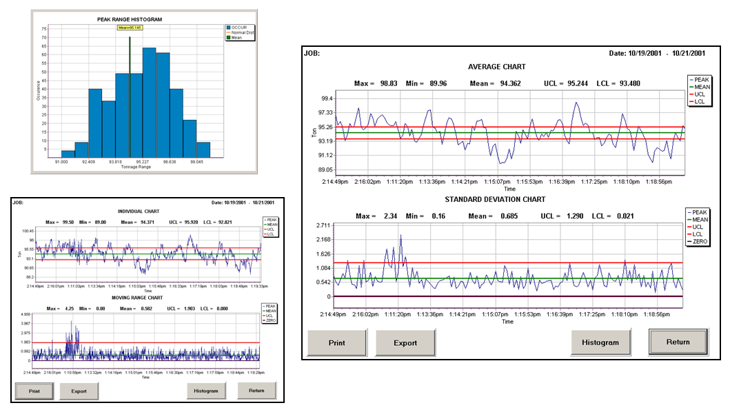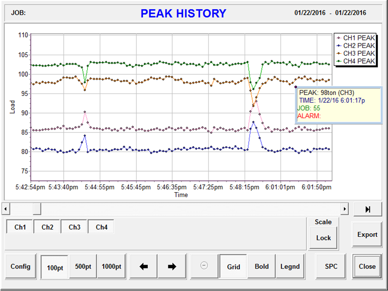 PTM Loadgards is capable of storing last 4 million strokes of tonnage information. The monitor has the built-in peak history graph that you can easily monitor the trend of peak variations in any given time in the past or you can export the data to CSV file into your USB memory and bring up on your spread sheets. The each stroke of peak history data contains date & time, peak tonnages per channel, job no, and tonnage alarm flags if any.