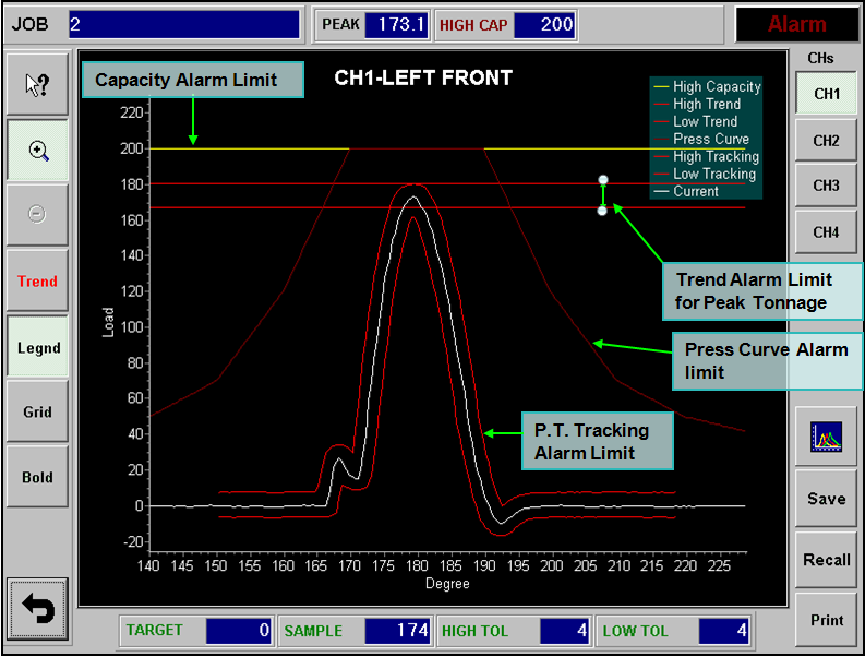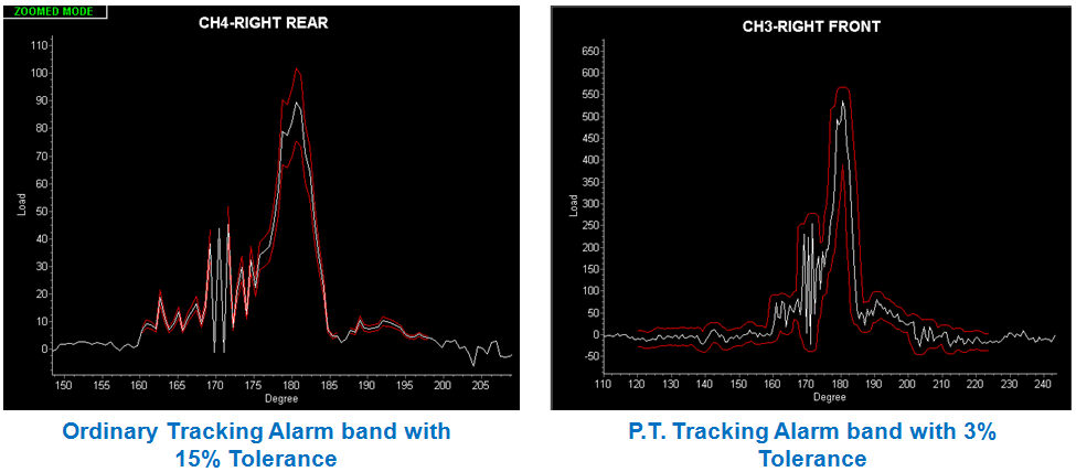 The PTM Loadgard series also features our unique PT (Perpendicular Tolerance) Track sampling technique that tonnage tolerance alarm limits envelop around the force signatures evenly throughout area. This reduces the nuisance alarm dramatically and allows the system to be sensitive enough to detect the subtle variations in tonnage due to changes in material thickness or hardness, inconsistent die lube, worn tooling, slugs, splits and wrinkles.
