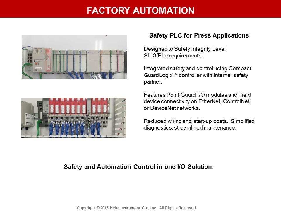 The HelmPak Press Control system can be designed with integrated safety and standard control utilizing a primary GuardLogix controller and Safety Partner processor. The system can be configured with Guard I/O modules and CompactBlock™ for field device connectivity on Ethernet or DeviceNet networks. Designed to Safety Integrity Level (SIL) 3.